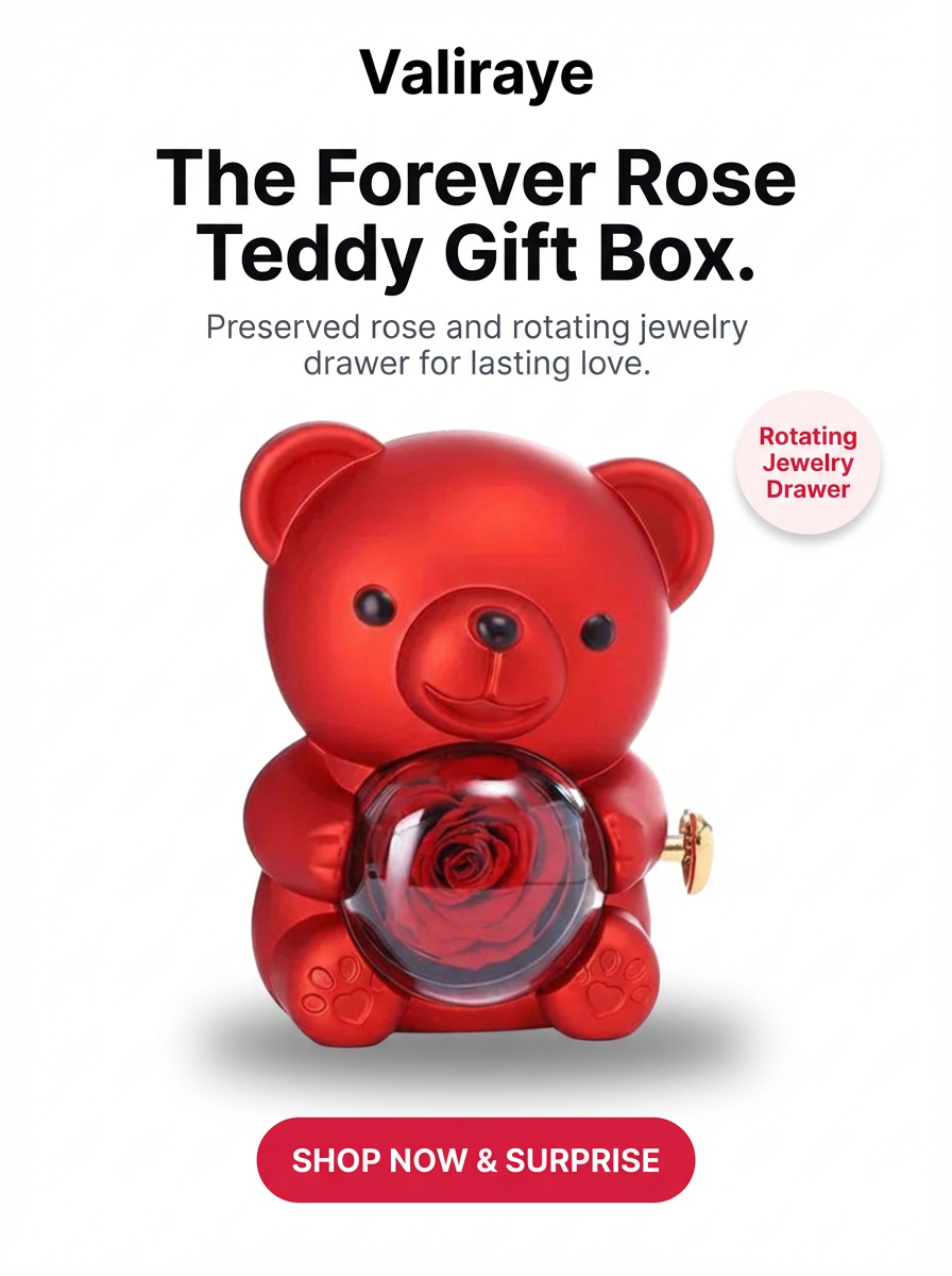 Symbolize eternal love with this preserved rose and bear display, featuring a hidden rotating drawer. It is the perfect keepsake for storing precious jewelry in a charming, protective case.